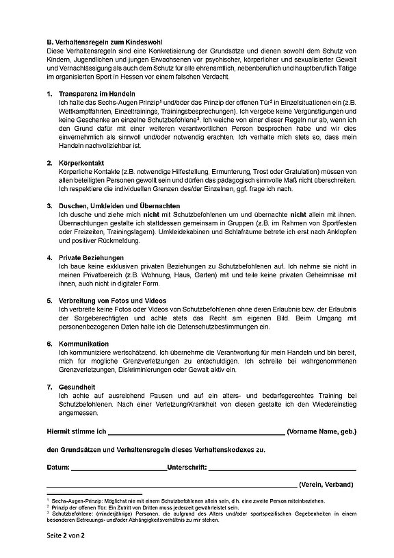 Der Verhaltenskodex und die Verhaltensregeln zum Kindeswohl (Anlage Ex. LSBH) wurden von allen in der Jugendarbeit tätigen Trainern und Betreuern unterschrieben.